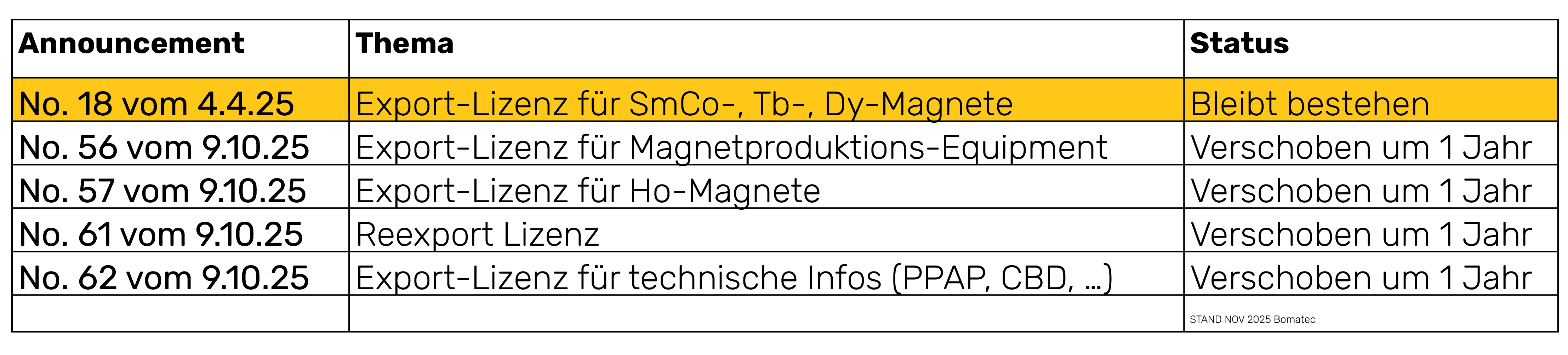 - Bestehende Regeln gelten weiterhin: Frühere Exportkontrollen (z. B. für Samarium, Terbium, Dysprosium) bleiben bestehen.