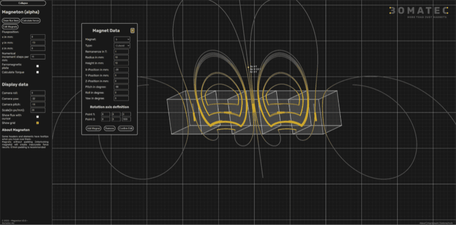 Magneton 2 ist das innovative, browserbasierte Tool für die schnelle und anschauliche Berechnung von Kräften, Flusslinien und Flussdichten beliebig vieler Permanentmagnete – flexibel, leistungsstark und direkt auf Ihrem Endgerät. Die Berechnung der Verteilung der magnetischen Flussdichte erfolgt mit Hilfe des Biot-Savart-Gesetzes.. Darauf aufbauend werden die Kräfte zwischen den beiden Permanentmagneten mit Hilfe des Maxwellschen Spannungstensors bestimmt.